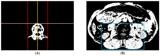 (b) Paraspinal muscle localization: This step is designed to find a bounding box enclosing the entire paraspinal muscles for further analysis. The L3 vertebra region was identified by using the connected component analysis from the bone tissue pixels in the original image (Figure 7A). A bounding box was obtained based on the vertebra region using the following methods. The upper border of the bounding box was determined by the upper bound of the vertebra region. The lower border of the bounding box was determined by the bottom-most pixel of the paraspinal muscle candidates. The left and right borders of the bounding box were determined by shifting the vertical center line of the vertebra (yellow line in Figure 7A) to the left and right directions by two times the greater distance of the left and right bounds of the vertebra region from the vertical center line (Figure 7B). Connected component analysis was then used to filter out the small regions in the bounding box.