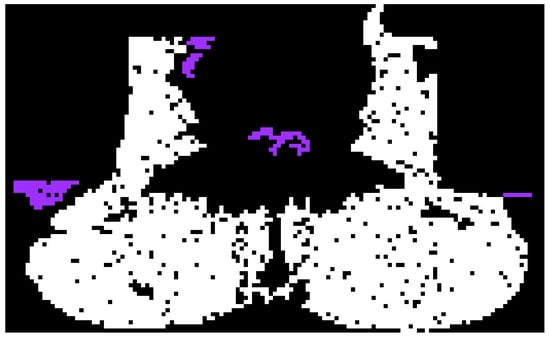 (d) Paraspinal muscle refinement: The goal of this step is to refine the segmented paraspinal muscles. Connected component analysis was used, and criteria regarding the location and size of the regions were enforced to remove the non-muscle regions (Figure 9). The regions located at the identified vertebra region were removed. The regions near the top, left, and right borders were removed. The small regions were removed. The holes in the image were filled.