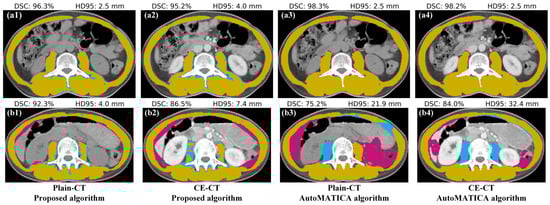Demonstration of the skeletal muscle segmentation results using the proposed algorithm and the AutoMATICA algorithm. (a1–a4) Both the algorithms perform well on the plain and contrast-enhanced CT images of a patient case; (b1–a4) both the algorithms perform poorly on the plain and contrast-enhanced CT images of another patient case. The algorithm segmentation result is shown in pink region, the gold standard is shown in the blue region, and the overlap is shown in the yellow region. Abbreviation: DSC, dice similarity coefficient; HD95, 95th quantile of the Hausdorff distance; Plain-CT, plain CT images; CE-CT, contrast-enhanced CT images.