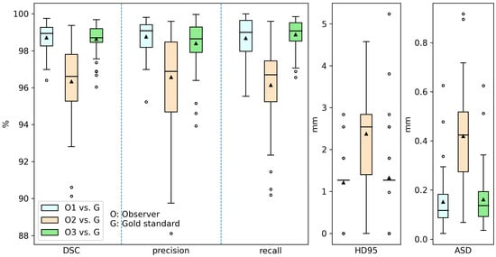 Figure 11 shows the distributions of inter-observer variation in DSC, precision, recall, HD95, and ASD, respectively. We can see that O1 and O3 showed greater agreement with the gold standards compared to those of O2. The reference metrics determined with the averaged DSC, precision, recall, HD95, and ASD over O1, O2, and O3, were 97.9 ± 1.7%, 97.9 ± 1.9%, 97.9 ± 1.9%, 1.6 ± 1.0 mm, and 0.2 ± 0.2 mm, respectively. The difference between the summary metrics of the proposed algorithm and the reference metrics were 4.7%, 1.2%, 7.9%, 3.2 mm, and 0.6 mm, respectively, for DSC, precision, recall, HD95, and ASD.