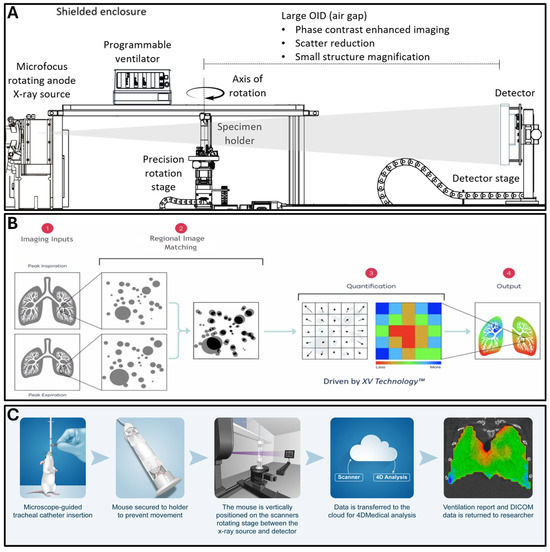 (A) The 4DXV instrument hardware is depicted, which consists of an X-ray source, a detector, and a specimen holder which secures an animal in the X-ray beam while rotating on a stage with precision angular rotation in tandem with a programmable ventilator. This system is designed to provide phase contrast lung images of mice. (B) 1. X-ray imaging datasets are obtained by the scanner during ventilation to derive peak inspiration and peak expiration images for computational analysis. 2. Regional image matching software evaluates regional changes between ventilation phases for a single animal. 3. Quantitation of changes is performed by 4DMedical software algorithms. 4. Heat map overlays are computationally derived, depicting quantitative regional changes in functional metrics within the lung parenchyma. (C) The animal preparation process for imaging includes anesthesia, tracheal catheter insertion, and the securing of the animal to the specimen holder for placement between the X-ray source and the detector. The vertically positioned animal undergoes X-ray scanning, and data is transmitted to the cloud for analysis by 4DMedical software algorithms. Data including ventilation reports and DICOM files are returned to researchers for evaluation. Danielle Dobbs assisted with the preparation of the artistic drawings using Adobe Illustrator (version 29.3; www.adobe.com, accessed on 17 June 2025).