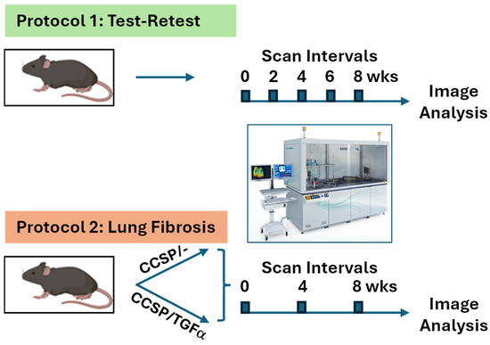 The scanning protocols for the murine subjects are summarized in Figure 2 for the longitudinal test–retest study (Protocol 1) and the longitudinal lung fibrosis study (Protocol 2).