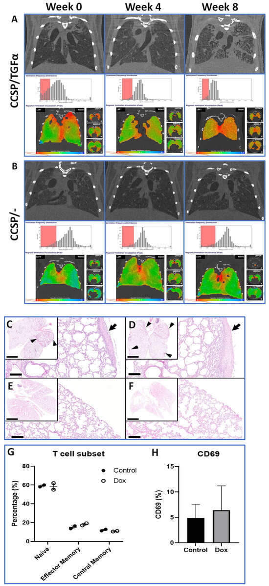 (A) X-ray scans of CCSP/TGFα mouse lungs at baseline (week 0), 4 weeks, and 8 weeks post-doxycycline administration. Corresponding regional ventilation heat maps and ventilation frequency distribution histograms are provided. The red box spans from 0 to 60% of the mean specific ventilation. (B) X-ray scans of CCSP/- mouse lungs at baseline (week 0), 4 weeks, and 8 weeks post-doxycycline administration. Corresponding regional ventilation heat maps and ventilation frequency distribution histograms are provided. The red box spans from 0 to 60% of the mean specific ventilation. Representative histological lung sections from two separate CCSP/TGFα mice (C,D) and two separate CCSP/- mice (E,F) 8 weeks post-doxycycline administration. CCSP/TGFα mice had pleural and subpleural fibrosis (arrows) multifocally in the lung lobes (arrowheads, insets). Hematoxylin and eosin staining. Bars: 3 mm and 200 μm (insets). (G) Lung-infiltrated immune cells collected from CCSP/- and CCSP/TGFα mice 8 weeks post-doxycycline administration with T cell subsets defined by CD44 and CD62L expression in the T cell compartment. Naïve (CD62L+ CD44−), effector memory (CD62L− CD44+), and central memory (CD62L+ CD44+). (H) CD69 expression analyzed from the total T cell compartment in the isolated lung-infiltrated immune cells (n = 2/group). Data are means (±SEMs), and statistical significance between groups was measured using one-way ANOVA.