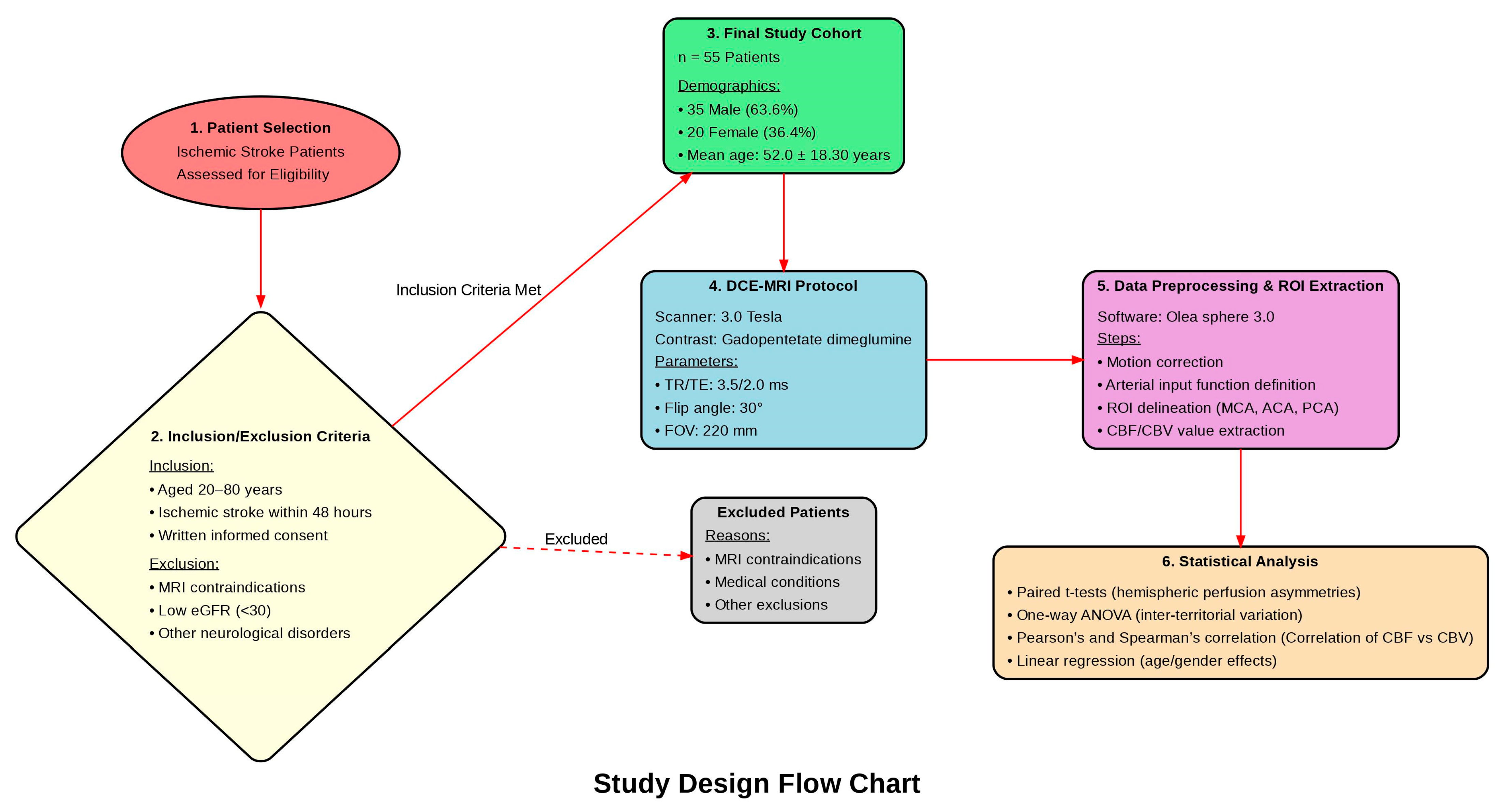 Figure 1The age range for inclusion was set between 20 and 80 years to focus on adults with ischemic stroke while excluding the potential confounding effects of age-related comorbidities. Although older patients are often included in stroke studies, individuals over the age of 80 were excluded from this study to minimize the potential impact of age-related comorbidities, such as severe cardiovascular diseases, cognitive decline, and other systemic conditions, which are more prevalent in this age group and could confound the interpretation of cerebral perfusion dynamics. The sample size of 55 participants was selected based on the resources available at the study site, the institutional capacity for patient recruitment, and the practical considerations of conducting the research within the given timeline. Although power analysis was not performed, the sample size was determined to be adequate for the study’s objectives, based on clinical guidelines, prior studies, and resource constraints.