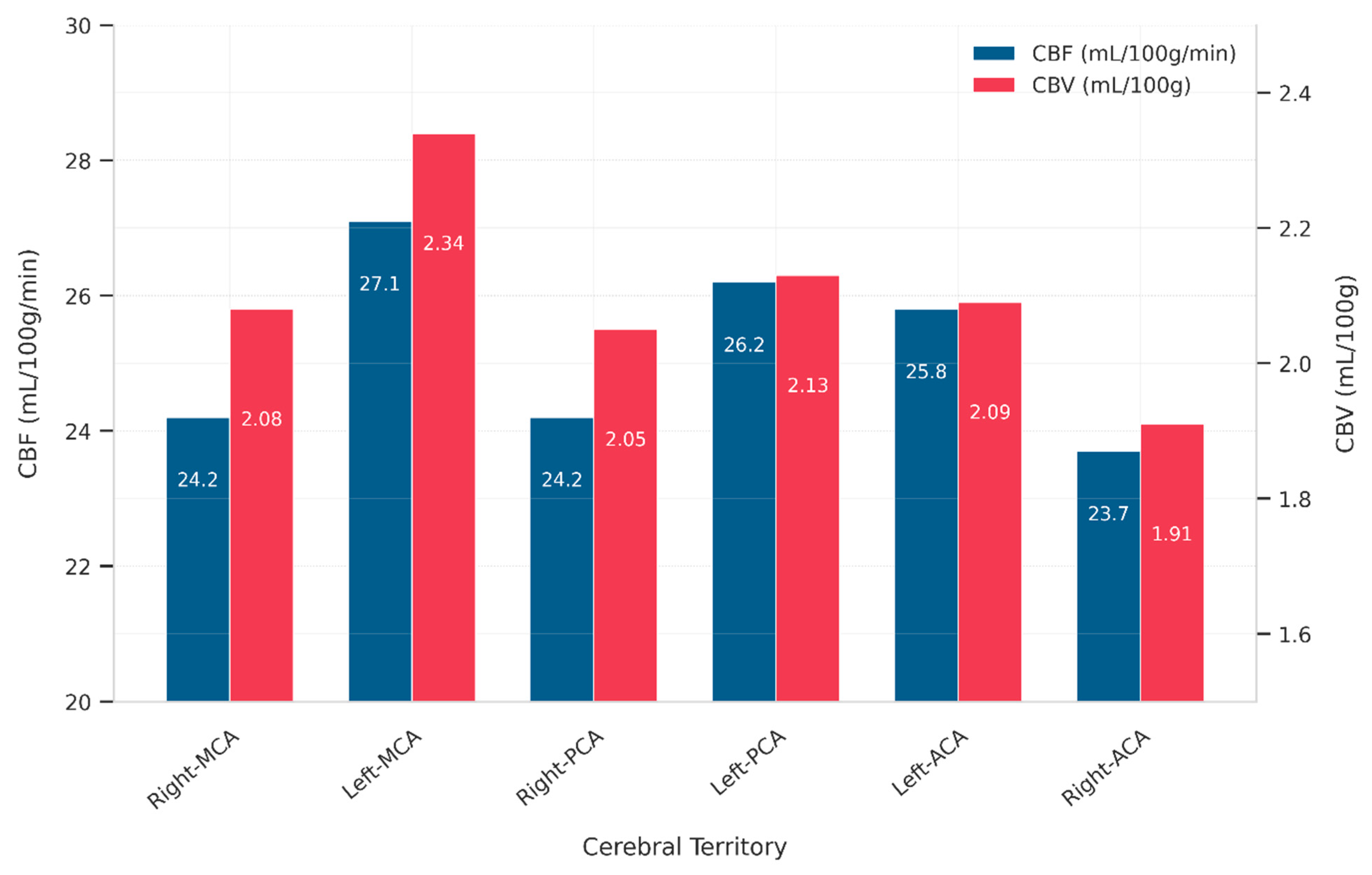 While several prior studies have reported that CBF and CBV vary across vascular territories, with differences between right and left hemispheres of MCA, ACA, and PCA [