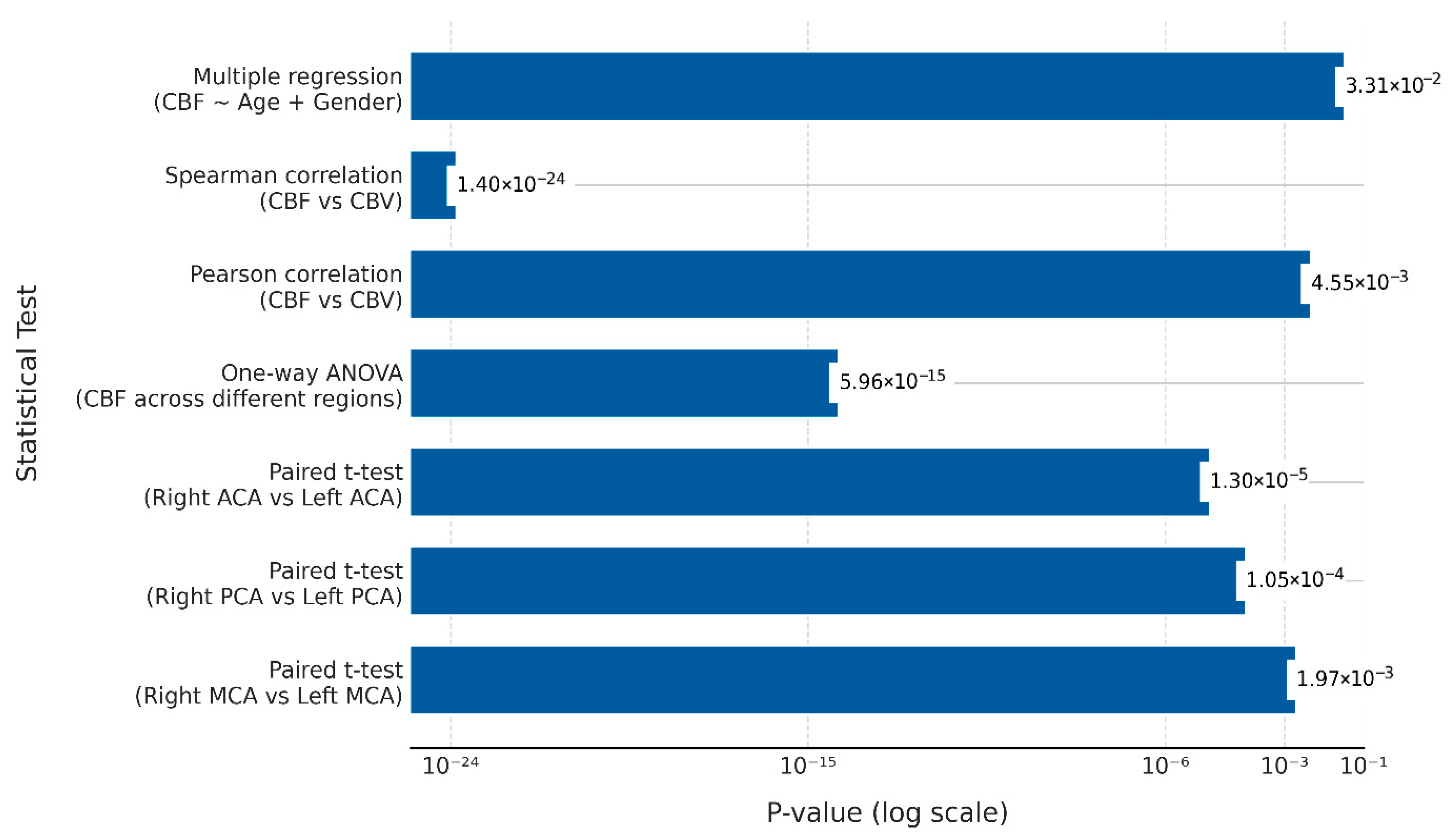 t-tests conducted between contralateral arterial regions (i.e., left and right MCA, ACA, and PCA) revealed statistically significant differences in CBF for all comparisons (right vs. left MCA: