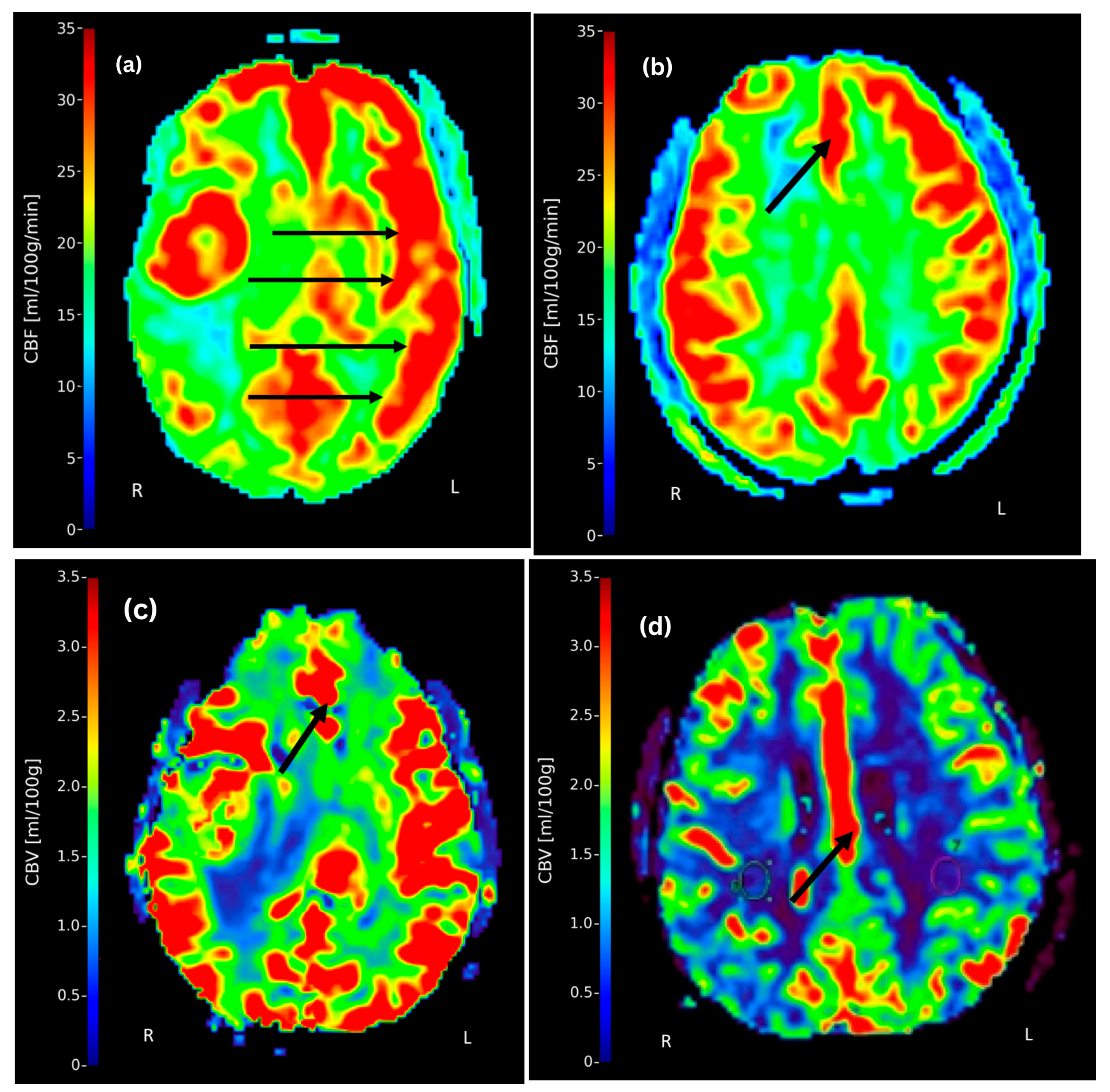 Figure 4, where panels (a) and (b) highlight elevated CBF in the left MCA and ACA territories, respectively. Panels (c) and (d) demonstrate lateralization of CBV, with reduced perfusion in the right ACA territory, visually confirming the descriptive trends reported in