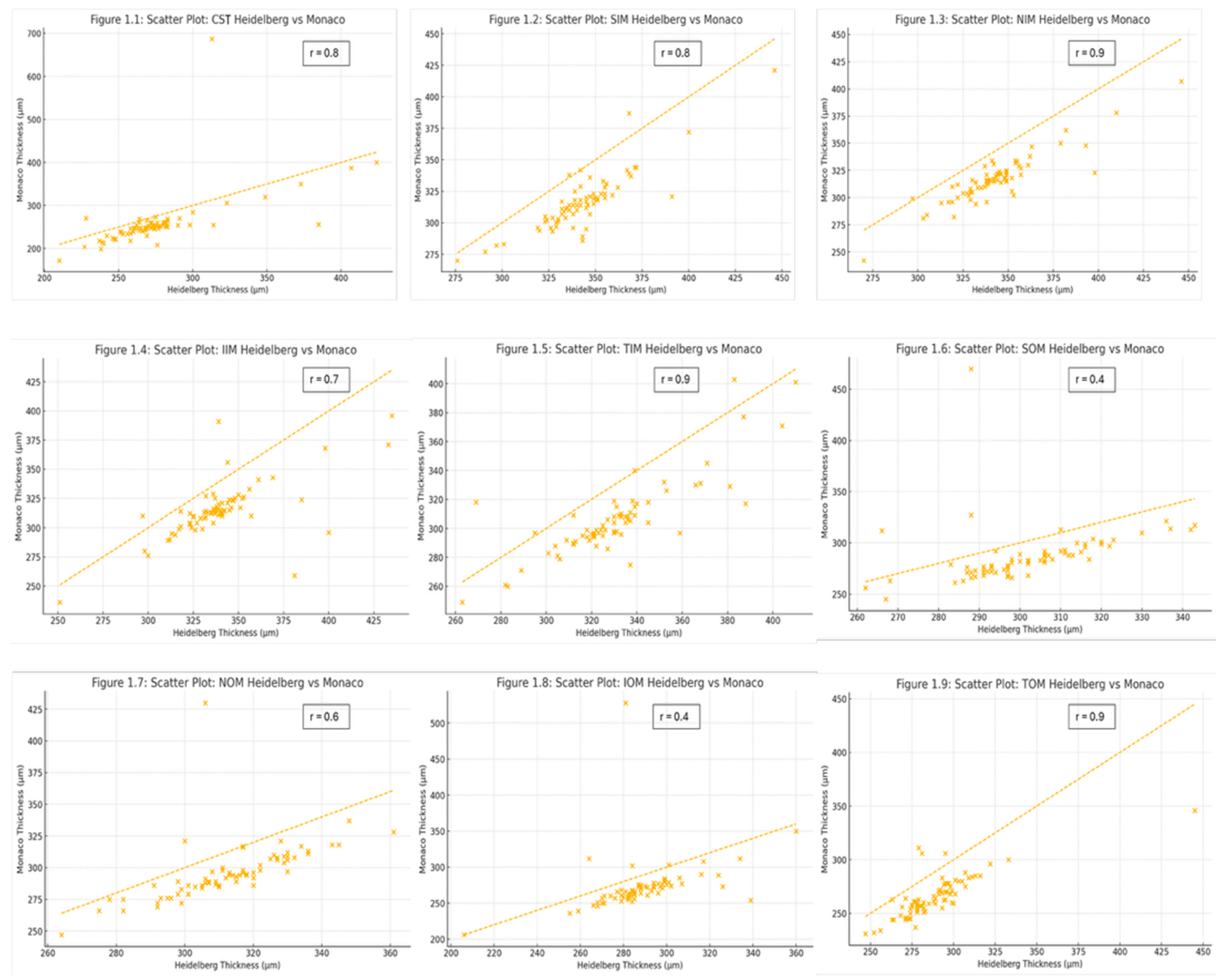 Statistical analyses were performed using GraphPad InStat (version 3.06; GraphPad Software, San Diego, CA, USA) and Python (version 3.11; Python Software Foundation) with the pandas, matplotlib, and SciPy libraries. Continuous variables were expressed as mean ± standard deviation (SD). Paired t tests were used to compare the mean retinal thickness values between devices for each ETDRS sector. The mean interdevice difference (Heidelberg minus Monaco) was calculated in micrometers (µm). Pearson correlation coefficients (r) with corresponding 2-tailed p values were computed to assess linear association between devices. Agreement was further evaluated using Bland–Altman analysis, reporting the mean difference and 95% limits of agreement. Scatterplots were generated to visualize correlation, and Bland–Altman plots were constructed by plotting the interdevice thickness difference against the average thickness for each ETDRS sector to evaluate systematic bias and measurement variability.