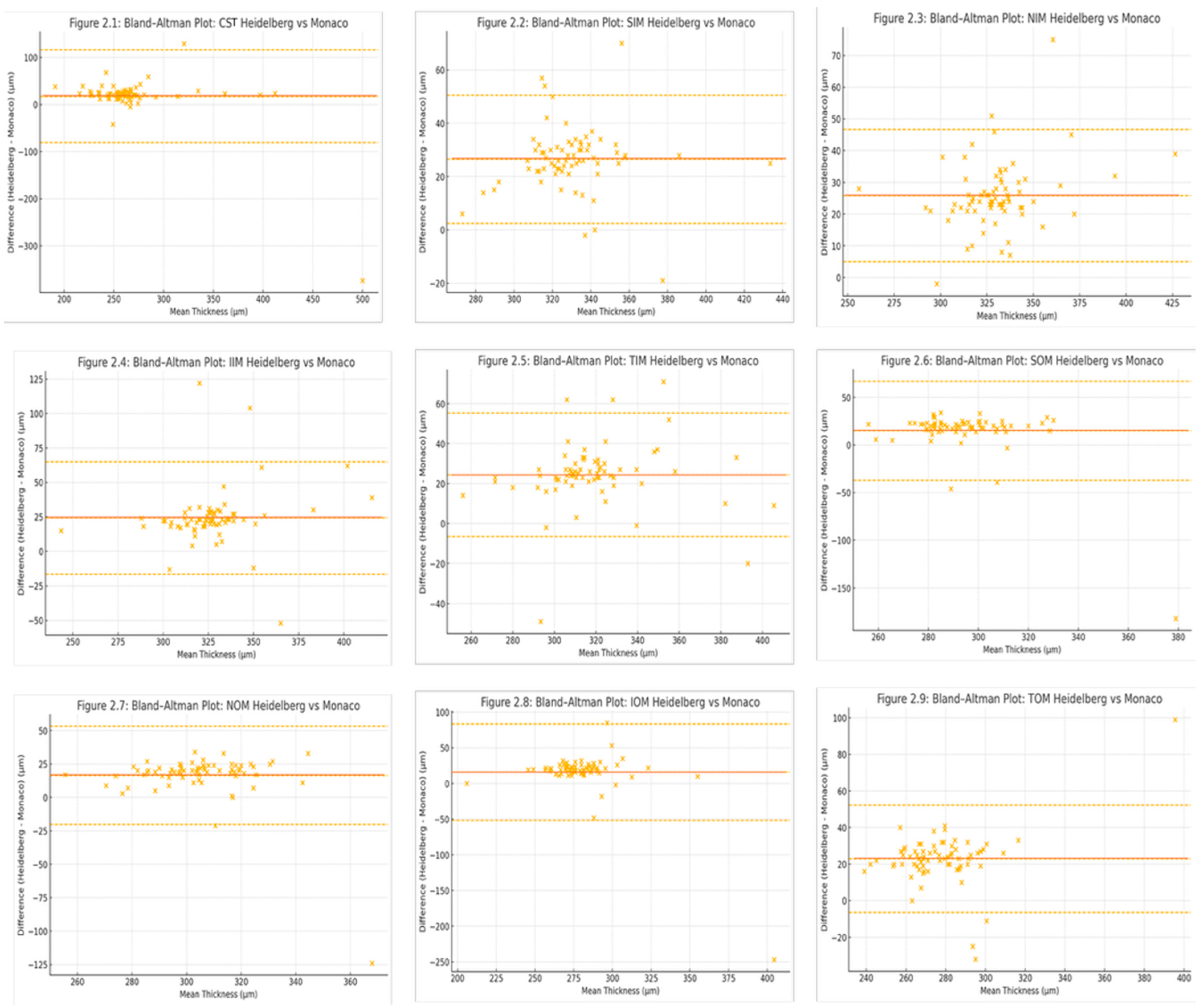 3]. However, that analysis was limited to manual measurements along the horizontal meridian at only 3 anatomical points, restricting its clinical generalizability. The present study expands on this work by systematically comparing retinal thickness measurements from the Optos Monaco and Heidelberg Spectralis OCT across all 9 ETDRS sectors in eyes without retinal pathology. The primary aim was to quantify interdevice agreement and assess the implications for interchangeability in both clinical practice and research applications where segmentation accuracy may be affected.