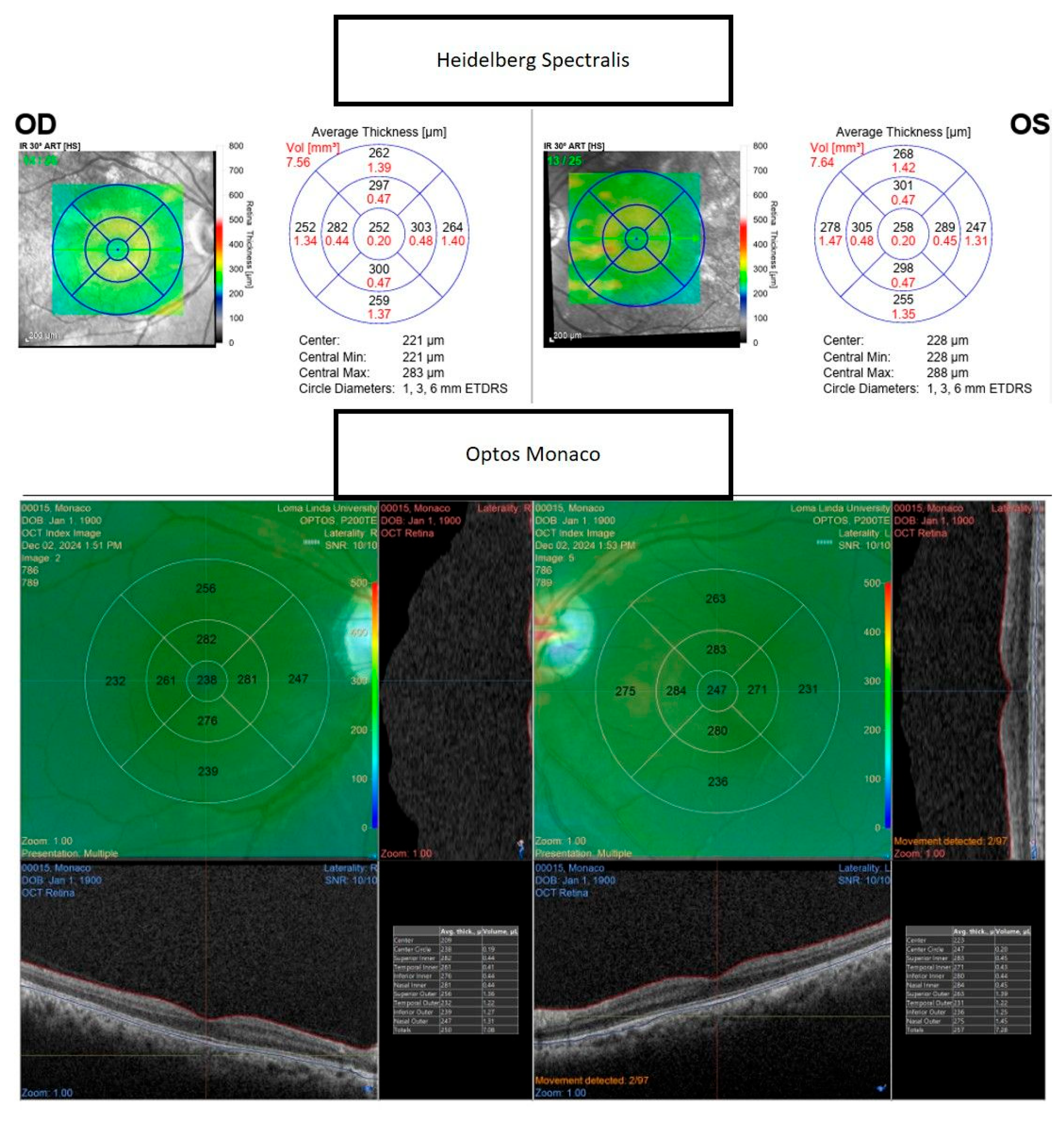 Our previous work involving 34 healthy eyes demonstrated close agreement between the Optos Monaco and Heidelberg Spectralis OCT measurements [