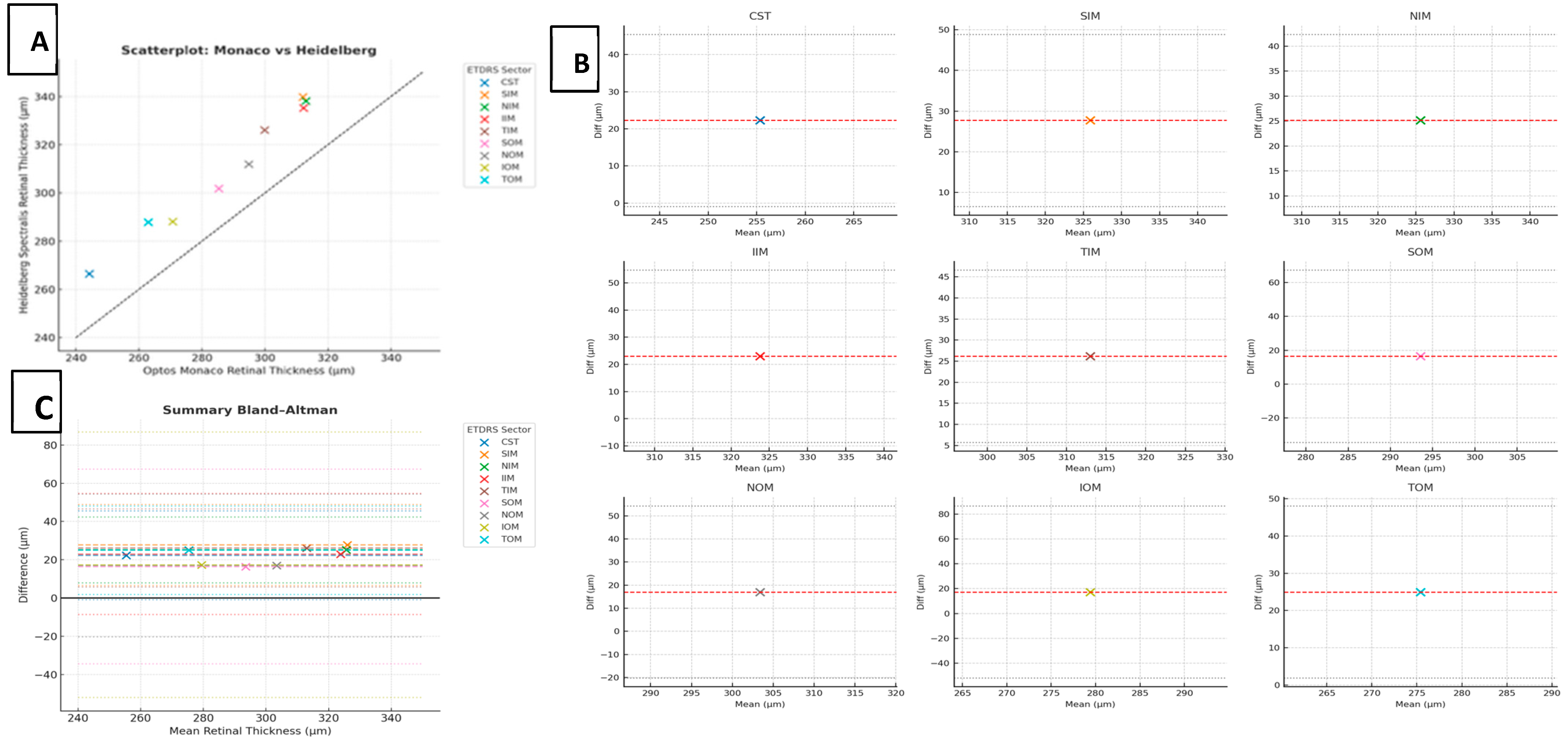 Thickness values were extracted from all 9 ETDRS sectors: the central subfield (CST); 4 inner ring sectors—superior (SIM), nasal (NIM), inferior (IIM), and temporal (TIM); and 4 outer ring sectors—superior (SOM), nasal (NOM), inferior (IOM), and temporal (TOM). The CST represented the mean thickness within a 1-mm–diameter circle centered on the fovea. The inner and outer rings had radii of 1 mm and 6 mm, respectively, centered on the same location. Data from each device were exported to spreadsheet format and merged by unique eye identifier to enable direct paired analysis.