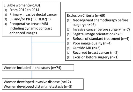 Sixty-nine women were excluded for the following reasons: (a) recipient of neoadjuvant chemotherapy (n = 43), (b) history of another invasive cancer (n = 7), (c) sagittal dynamic MRI acquisition (n = 5), (d) refusal of standard treatment (n = 4), (e) poor image quality (n = 4), (f) MRI performed at outside facilities (n = 3), (g) recurrent breast cancer (n = 2), and (h) prior excision before surgery (n = 1). For patients with multiple tumors, only the largest lesion was analyzed. Finally, 74 women with 74 triple-negative invasive breast cancers were included (Figure 1). All MRI examinations were performed after the initial breast cancer diagnosis.