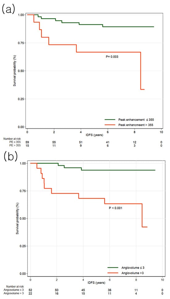 Kaplan–Meier survival curves for invasive disease-free survival (IDFS) by high and low peak enhancement and angiovolume groups. (a) The survival curves demonstrate that peak enhancement greater than 355% is associated with IDFS. (b) The survival curves demonstrate that angiovolume greater than 3 mL is associated with IDFS.