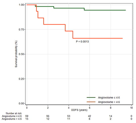 Kaplan–Meier survival curves for distant metastasis-free survival (DDFS) by high and low angiovolume groups. The curves demonstrate that angiovolume greater than 4.6 mL is associated with DDFS.