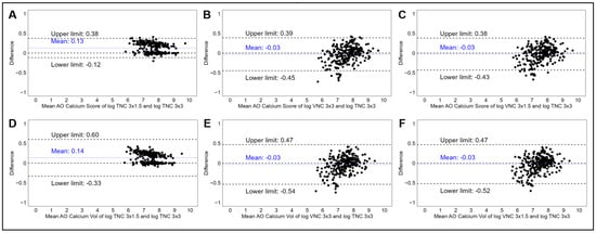 Figure 3. Panel of Bland–Altman plots demonstrating the mean log-transformed AVCS and difference in log-transformed AVCS measurements between TNC 3 × 3 mm and TNC 3 × 1.5 mm (A), TNC 3 × 3 mm and VNC 3 × 3 mm (B), and TNC 3 × 3 mm and VNC 3 × 1.5 mm (C). Bottom panel demonstrating mean log-transformed AVCV and difference in log-transformed AVCV measurements between TNC 3 × 3 mm and TNC 3 × 1.5 mm (D), TNC 3 × 3 mm and VNC 3 × 3 mm (E), and TNC 3 × 3 mm and VNC 3 × 1.5 mm (F). Abbreviations: AVCS, aortic valve calcium score; TNC, true non-contrast; VNC, virtual non-contrast.