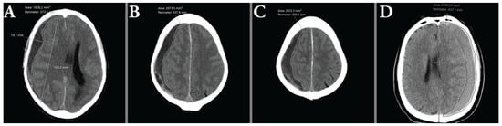 (A–C) show consecutive area measurements made on a hypoattenuating hematoma as part of the ABC/2 method. (D) illustrates the difficulties of measuring isoattenuating hematomas, due to the indistinct demarcation between brain parenchyma and hematoma.