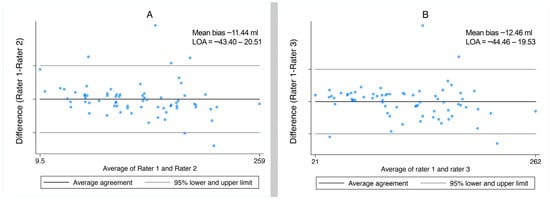 Bland–Altman plots for agreement for manual volume measurements by rater 1 compared to rater 2 (A) and by rater 1 compared to rater 3 (B). The mean bias (average difference between methods and limits of agreement (LOA = bias ± 1.96 × SD)) is shown in the graph.