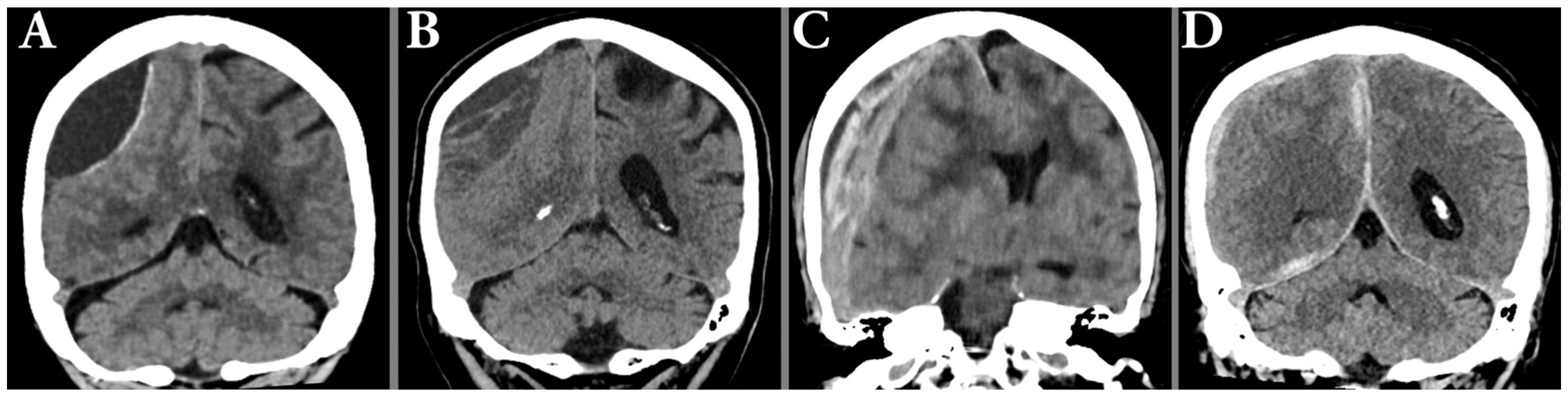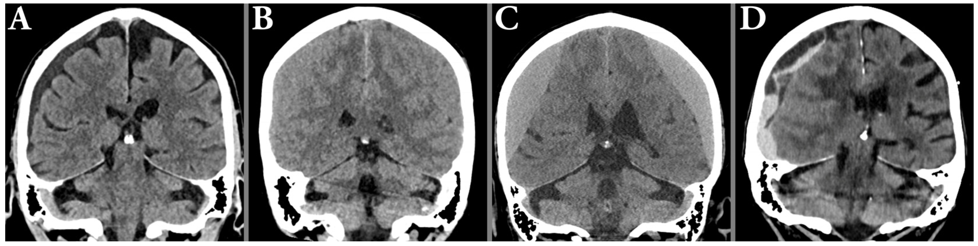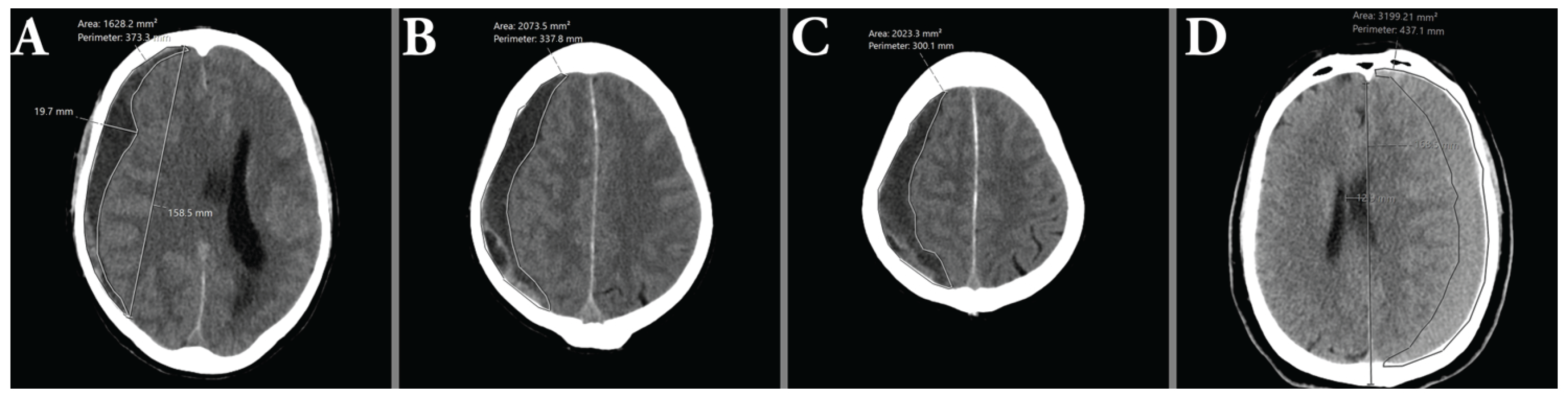 - Charehsaz, A.; Vayisoglu, T.; Uyaniker, Z.A.; Cekic, E.; Ozturk, E.; Isikay, A.I.; Hanalioglu, S. Relative Cortical Atrophy Index as a Strong Predictor of Recurrence After Surgery for Chronic Subdural Hematoma. Neurosurgery 2024, 95, 1369–1377. [Google Scholar] [CrossRef] [PubMed]