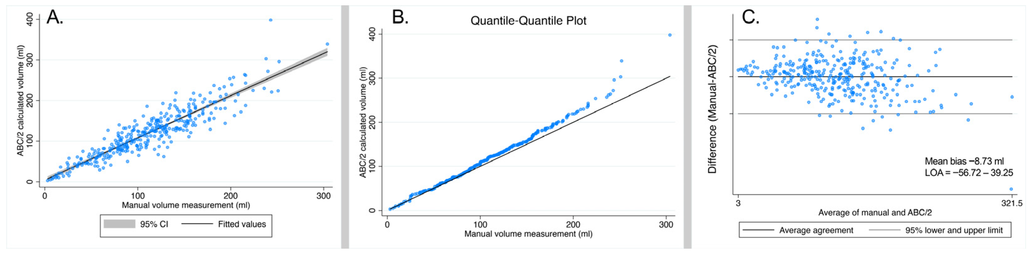 3.2. Comparison of Manual Measurements of Hematoma Volume with the ABC/2 Method