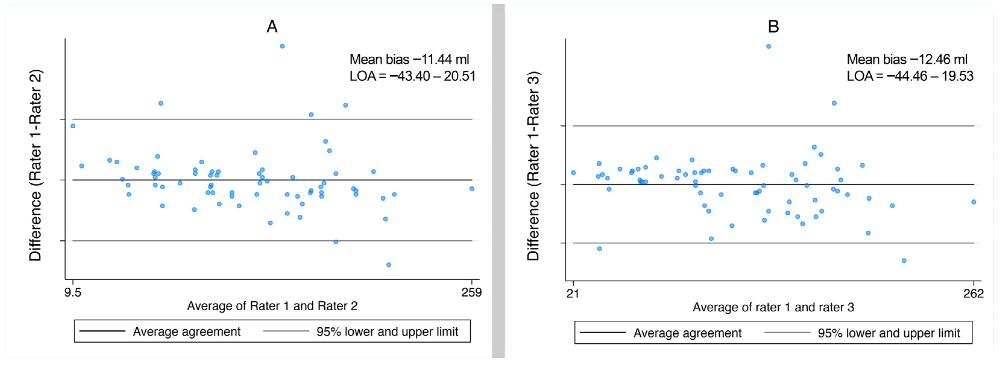 | Manual, mL (median, IQR) | 115.5 (72–156) | 123 (78–168) | ICC [3, 1] 0.95 (0.93–0.97) |
