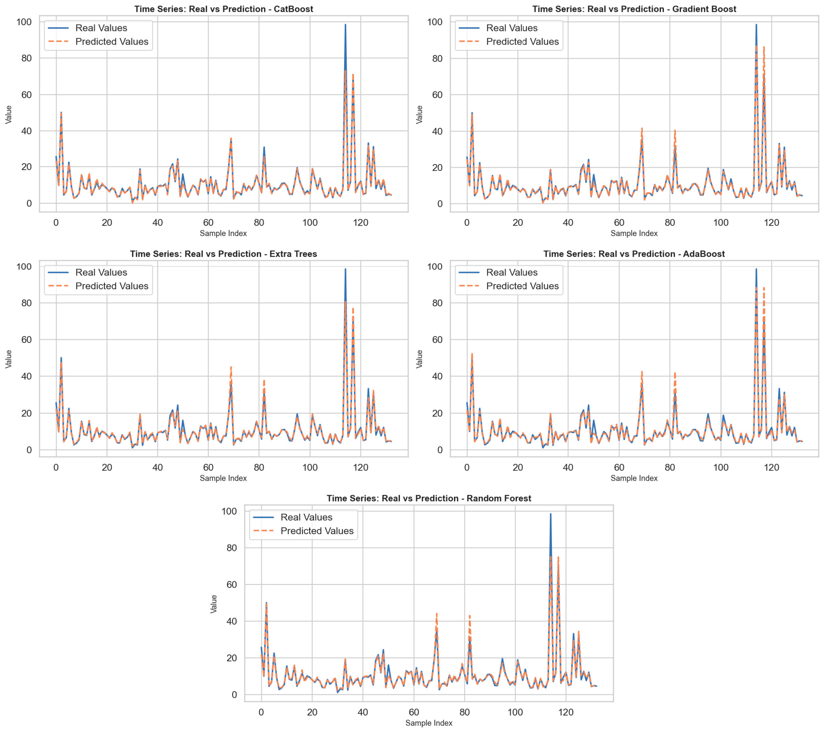 Figure 1. By closely examining the figures, the sensitivity of the models to changes over time was determined. Overall, it was found that every model was well able to predict low, medium, and high values, especially well in terms of predicting changes that happened within specific periods. But for those points that experienced sudden jumps in terms of high values, some models were not so good in predicting such extreme values, thus increasing their prediction errors. Specifically, the CatBoost model, along with the Gradient Boost model, can be seen as the algorithms that generated predictions closest to the real value. These two models demonstrated sensitivity to high-frequency changes and were able to closely follow the actual curves even at extreme values. In contrast, while the Extra Trees and AdaBoost models effectively tracked general trends, prediction deviations became more pronounced, especially at peak values. The Random Forest model, on the other hand, produced a relatively smooth prediction curve and diverged from the actual data in some time periods. This is due to the model’s overly smoothing effect. In conclusion, the findings reveal that CatBoost and Gradient Boost models are more successful in problems involving dynamic structures such as time series prediction.