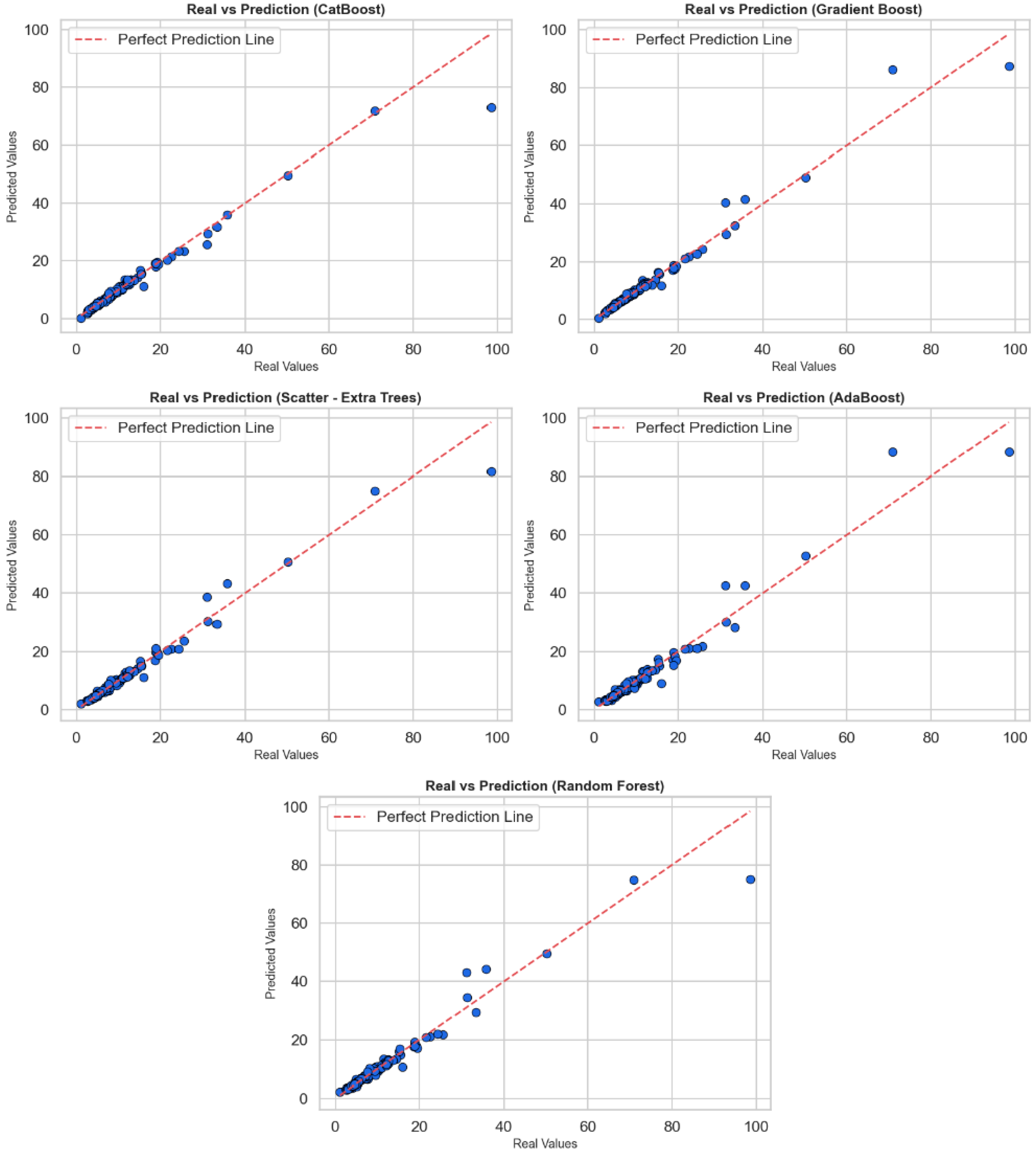 Figure 2 contains scatter plots reflecting the relationship between actual values and predicted values to evaluate the regression performance of CatBoost, Gradient Boost, Extra Trees, AdaBoost, and Random Forest algorithms. In each sub-graph, the horizontal axis shows the actual values, while the vertical axis shows the values predicted by the model; a red dotted line has been added as the perfect prediction line (y = x). The proximity to this line is a visual indicator of the model’s prediction accuracy. When the graphs are examined as a whole, all models make their predictions very close to the actual values in most cases. Most of the points are clustered close to the red reference line, indicating that the models have learned the general trends correctly. However, in each model, deviations from the reference line are noticeable, especially at high-value outliers. These deviations indicate that the models perform relatively poorly in predicting extreme values and that systematic errors may occur in some cases. In particular, the CatBoost and Gradient Boost models are positioned closer to the red line across a wide range of values, indicating that they provide more stable and generalizable predictions. Extra Trees and Random Forest models also perform similarly well, but prediction deviations are observed in a few high-value examples. AdaBoost, on the other hand, provides successful predictions in the low value range but shows more deviation at medium and high levels. In conclusion, these graphs show that models are evaluated not only based on statistical metrics but also in terms of visual consistency. CatBoost and Gradient Boost algorithms stand out in regression accuracy, but all models require careful analysis and potential model improvements at high values.