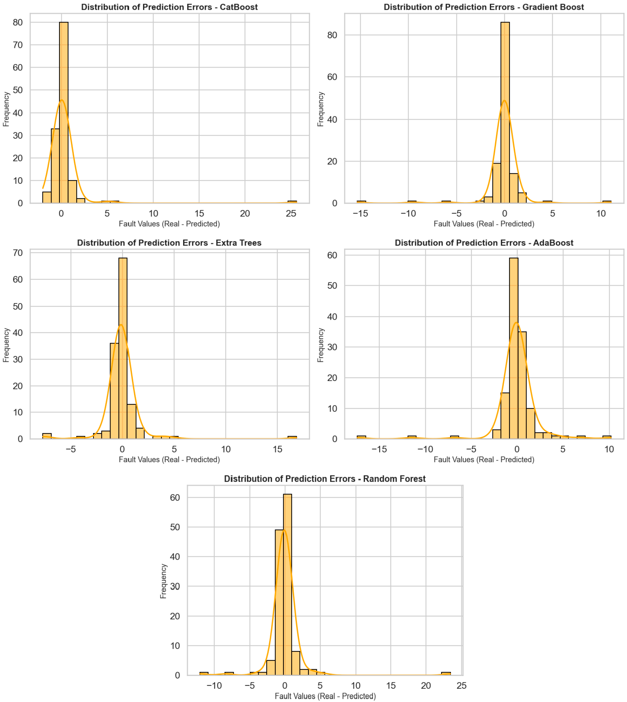 Figure 3 shows the distribution of prediction errors for five different regression algorithms (CatBoost, Gradient Boost, Extra Trees, AdaBoost, and Random Forest), visualized using histograms and density curves. The horizontal axis represents prediction errors (actual value—predicted value), while the vertical axis represents the frequency of these errors. These graphs are very valuable for analyzing the deviation behavior of models and seeing to what extent predictions are prone to error. When the graphs are examined in general, it can be observed that prediction errors in all models are concentrated close to zero, i.e., within the correct prediction range. In particular, the error distribution in the CatBoost, Gradient Boost, and Extra Trees models is quite symmetrical, with a dense accumulation around the center (around 0). This implies that such models forecast without systematic bias and tend to perform with small errors. The CatBoost model was highly accurate with most errors between −2 and +2. Both the Gradient Boost and Extra Trees models also have a concentrated distribution of errors, but more infrequent but meaningful deviations are recorded at extreme points. The error distribution in the AdaBoost model is more spread out, and there is greater variation between +5 and −5. The Random Forest model primarily follows the central distribution but produces prediction errors greater than 10 for certain outliers. Overall, these distribution charts are crucial to study not only the average performance of the models, but also their reliability and their capacity to respond in unexpected situations. CatBoost and Gradient Boost models demonstrate a stable prediction performance with tight ranges and central density for the distribution of error, whereas for AdaBoost and Random Forest models’ performances, more cautious analyses and deeper optimization are needed due to the deviations of extreme values.