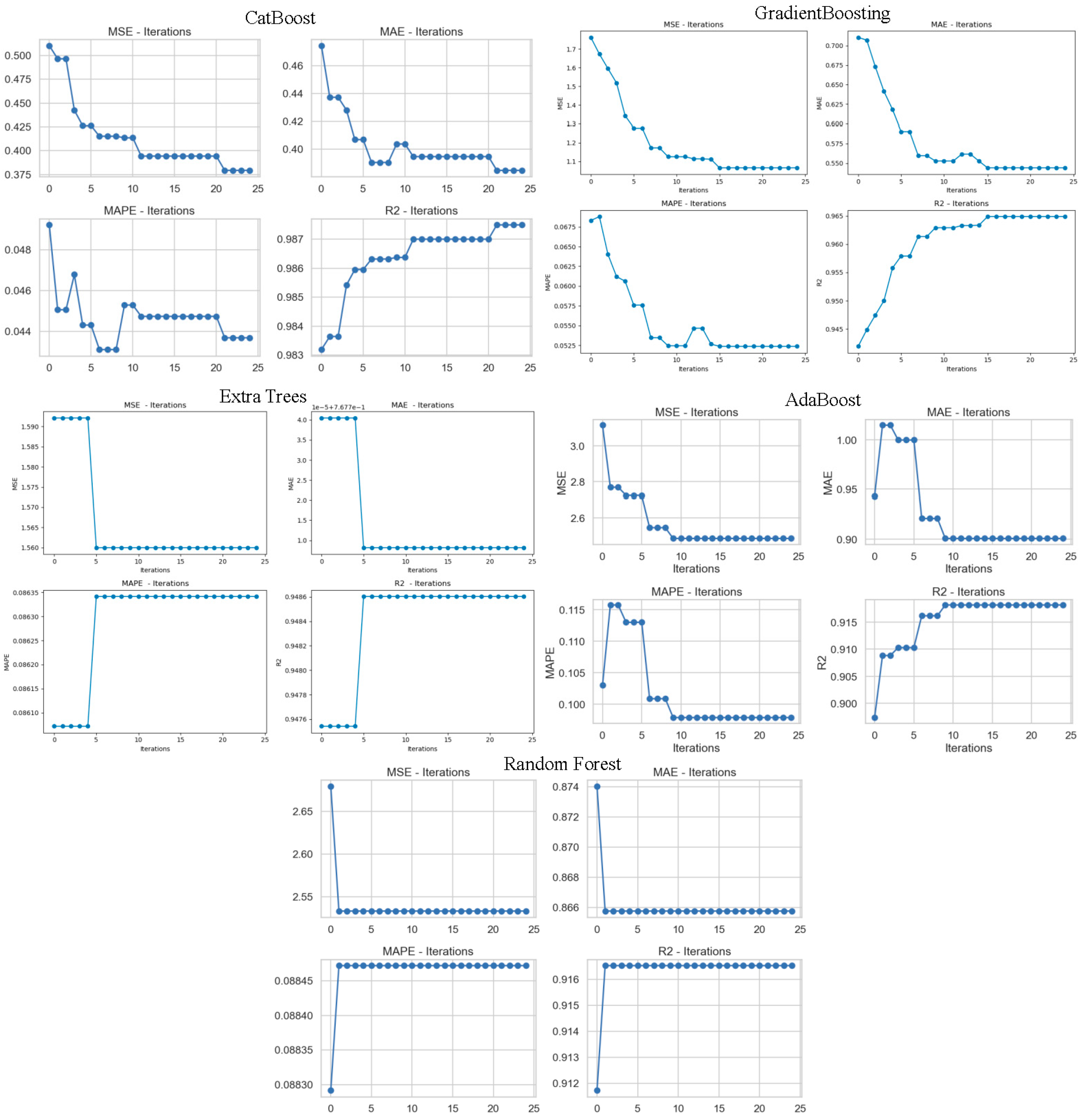 2) of the CatBoost, Gradient Boosting, Extra Trees, AdaBoost, and Random Forest models change with model iterations (number of trees or number of iterations in the learning process). These graphs were used to monitor the learning curve and convergence pattern of the models. Each graph provides comprehensive information about stability and performance overall by illustrating the way the model’s performance was enhanced during training. The CatBoost model showed a steady decrease in MSE, MAE, and MAPE values as iterations progressed, indicating that the model learned more with each step. The increase observed in the R