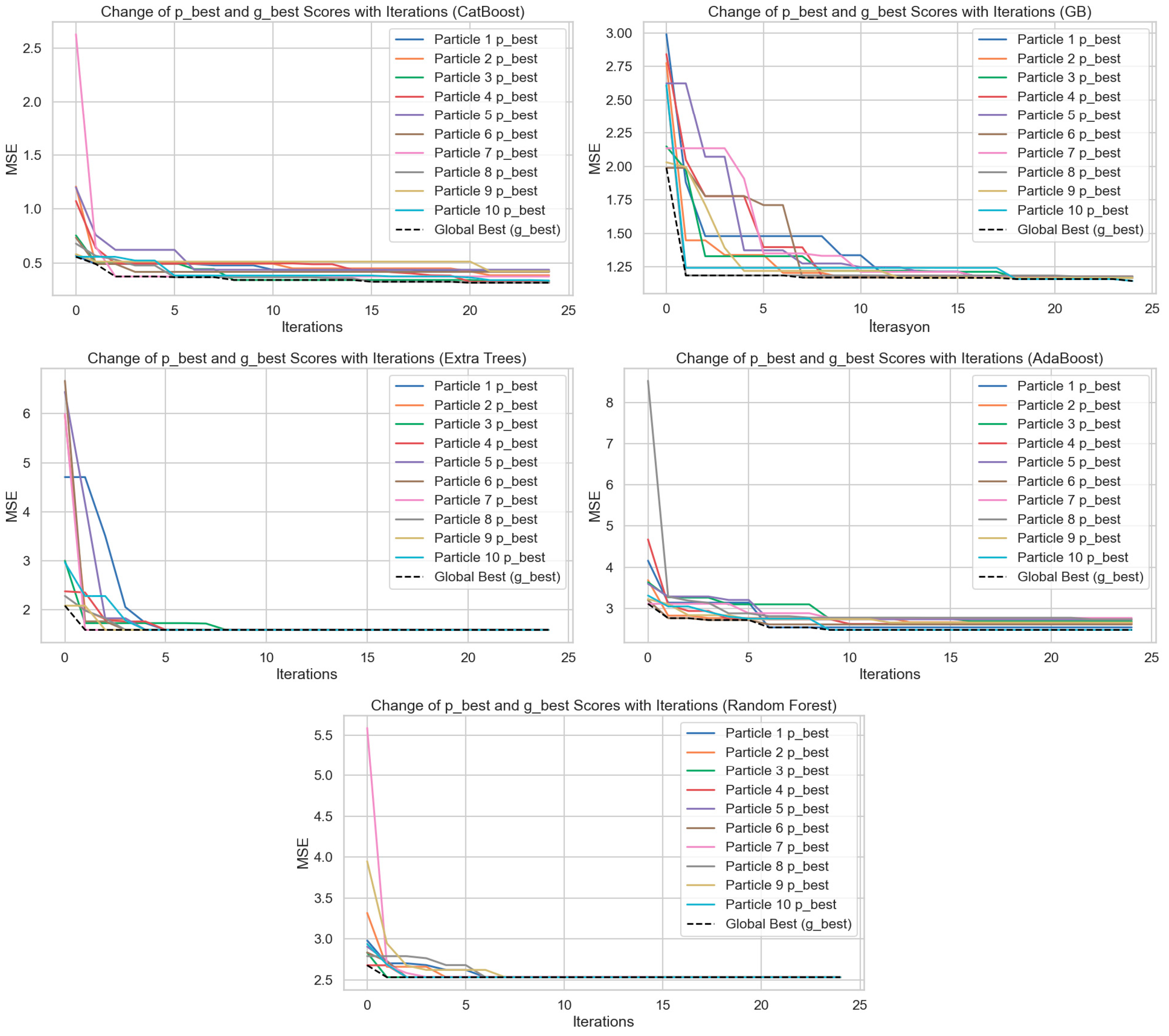 X-axis represents the iterations. When the graphs are considered collectively, it can be observed that with an increase in iterations in each model, both the particle best scores and the global best scores individually decrease substantially. This condition reflects that the PSO algorithm can optimize the hyperparameter space effectively and obtain lower errors at every iteration. The CatBoost model is observed to have declining MSE values at a fast and consistent rate. A better rate was observed in the first 5 iterations, beyond which both particle differences lowered, and the global best score became constant. The same pattern was observed for the Gradient Boosting algorithm, although particle differences were greater at the initial steps. Scores converged towards each other within approximately 10 iterations. The Random Forest and Extra Trees models both exhibited the same trend of an accelerating convergence pattern, steep drops in MSE values from the first 3–5 iterations. This indicates that the two models had both learned through hyperparameter tuning in the early stages. However, the subsequent stabilization of errors shows that the models reached a limited learning capacity and that further iterations did not provide marginal gains. In the AdaBoost model, the initial MSE values are higher, and there is greater variance among the particles. However, as iterations progress, errors decrease significantly, indicating that AdaBoost can be significantly improved through optimization. Overall, these graphs demonstrate that the PSO algorithm is a powerful tool for minimizing model error by providing effective optimization in the hyperparameter settings of regression models. Additionally, when comparing models, CatBoost and Gradient Boosting algorithms stand out in the optimization process by achieving lower and more stable MSE values. This study visually highlights the critical impact of hyperparameter optimization on model performance.