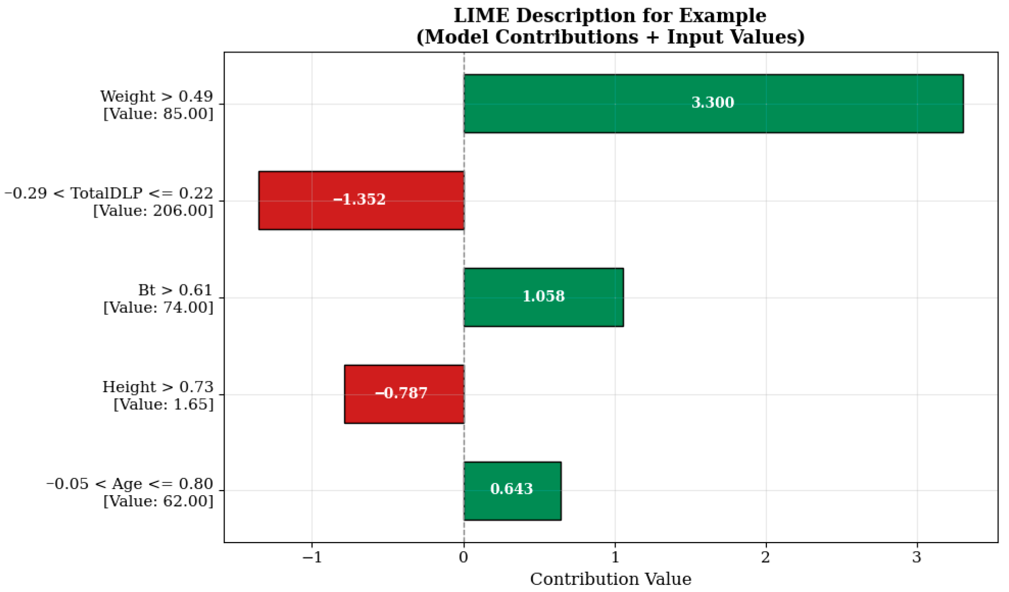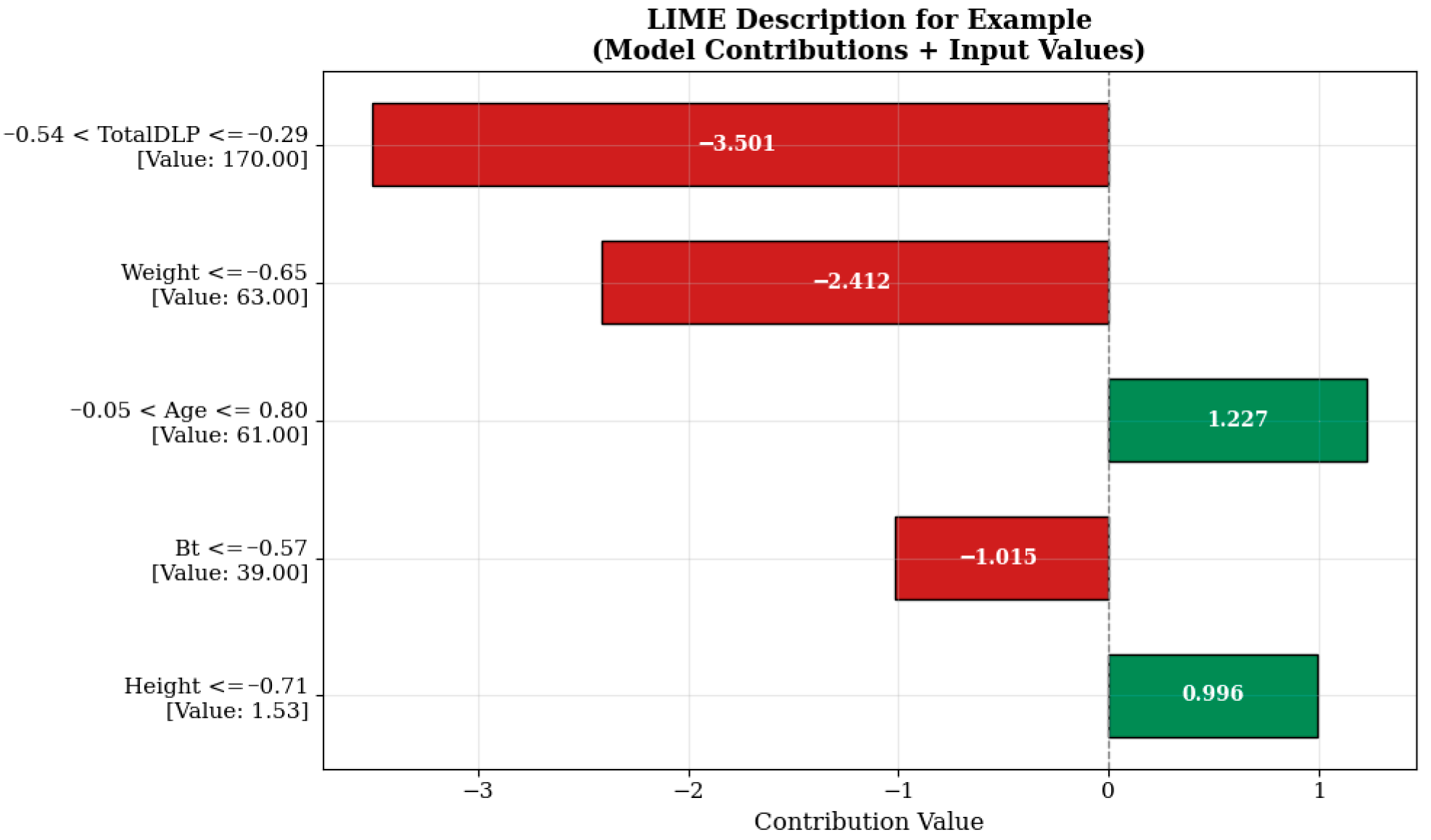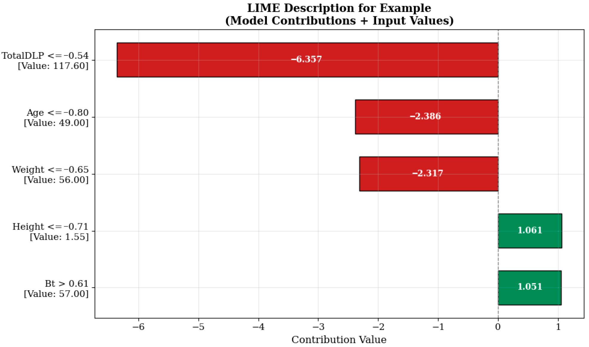 In this section, the LIME (Local Interpretable Model-Agnostic Explanations) method was applied to evaluate the explainability of the regression-based machine learning model developed to calculate breast-specific radiation dose in thoracic CT examinations. The aim was to clearly identify which clinical or demographic characteristics influence the radiation dose prediction for individual patient-specific breast organ samples and to what extent they influence it.
