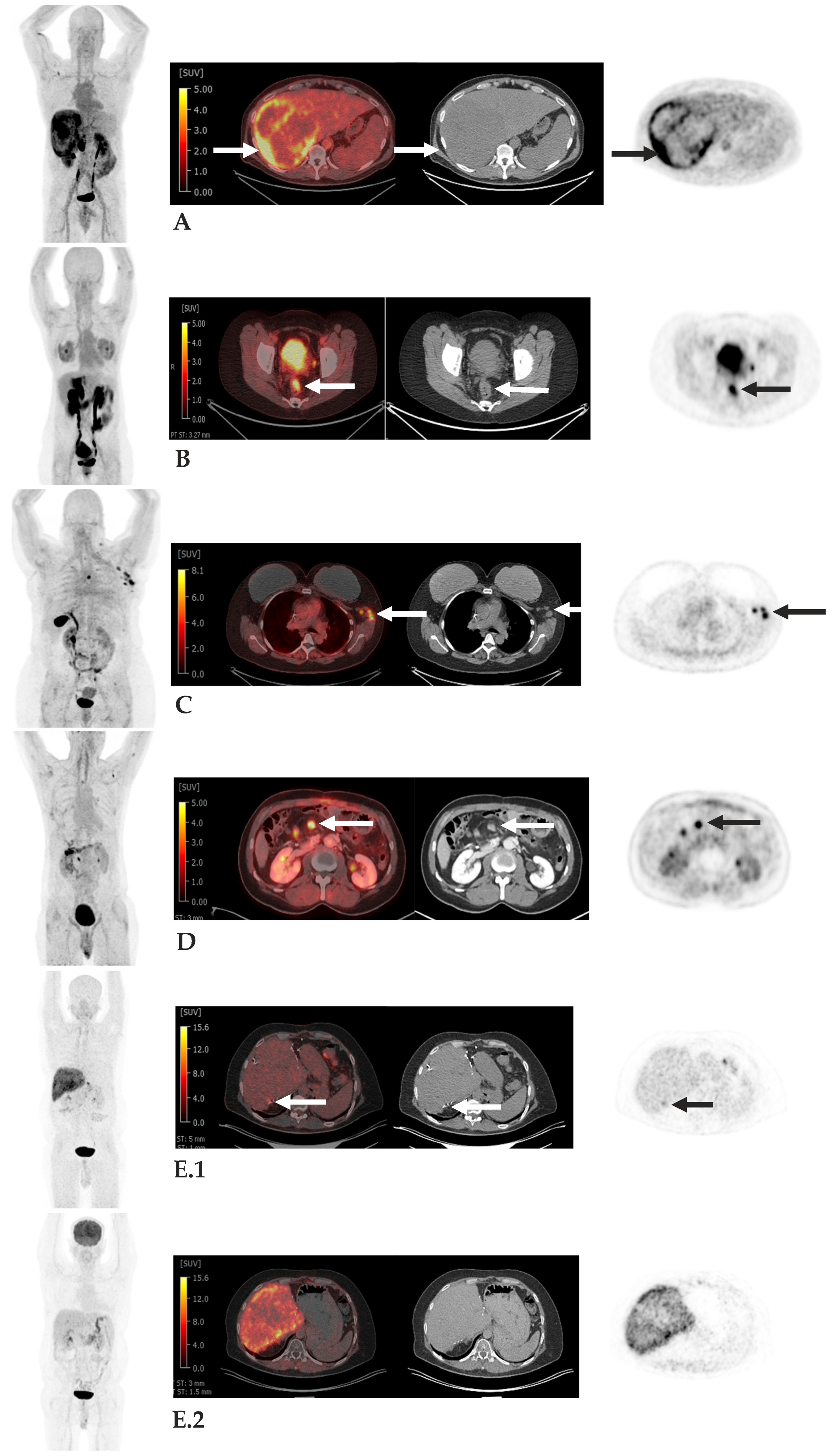 - Singh, S.B.; Shrestha, B.B.; Gandhi, O.H.; Shah, R.P.; Mukhtiar, V.; Ayubcha, C.; Desai, V.; Eberts, C.E.; Paudyal, P.; Jha, G.; et al. The comparative utility of FAPI-based PET radiotracers over [(18)F]FDG in the assessment of malignancies. Am. J. Nucl. Med. Mol. Imaging 2024, 14, 190–207. [Google Scholar] [CrossRef] [PubMed]