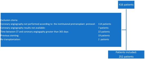 Of the 416 lung transplant patients, 252 had both a CT scan and coronary angiography performed within an interval of less than 365 days and constituted the study base. Of the 164 excluded patients, 114 did not have a coronary angiography performed according to our own institution protocol; in 7 cases, the coronary angiography results were unavailable; in 22 cases, the time between the CT scan and coronary angiography exceeded 365 days, and 2 patients were excluded due to undergoing a lung retransplant (Figure 1).