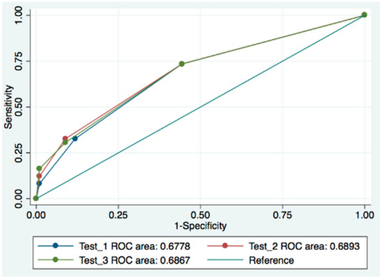 Comparison of the ROC curves of the three methods of calcium quantification according to CT findings with coronary angiography. Test 1. Artery-based method; Test 2: segment artery-based method; Test 3: visual assessment method.
