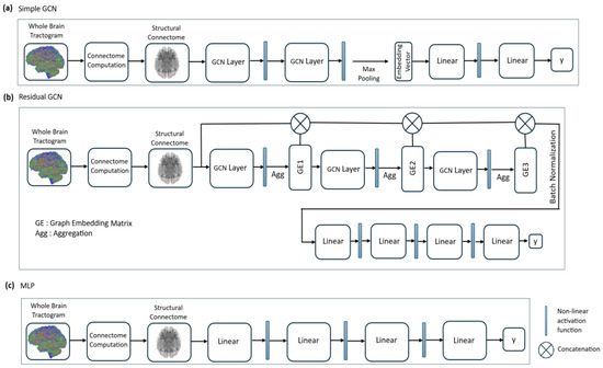 Two GCN models (simple [34] and residual), a deep neural network (multi-layer perceptron (MLP)), and two standard machine learning models (random forest (RF) and support vector machine (SVM)) were trained. Random Forest and SVM were selected as baseline models to enable a meaningful comparison with GNNs. Random Forest was chosen for its resilience to noise, capability to manage high-dimensional data like structural connectome features. SVM was included for its proven effectiveness in binary classification tasks and its capacity to capture non-linear relationships through kernel methods. Unlike GNNs, which directly utilize the graph structure of the connectome, these models rely on predefined features, offering a contrasting perspective. This comparison allowed us to highlight the benefits of graph-based learning and demonstrate the superior performance of GNNs in this context. Model architectures for both GCN models and the MLP are shown in Figure 1, and model sizes for these models are displayed in Table 2. The simple GCN model contains GCN layers with 64 neurons each, while the residual GCN model contains GCN layers with 32 neurons each. The simple GCN model uses ReLU activation functions between graph convolutional layers and mean global pooling for the generation of a graph embedding vector, while the residual GCN model uses tanh activation and mean aggregation functions between graph convolutional layers to create intermediate graph embedding matrices. The model architecture for the residual GCN is adapted from a model proposed in a brain connectomics benchmarking paper [5]. For the MLP network, hidden layers with 512, 256, and 128 neurons are used with ReLU activation. All models were implemented with PyTorch Geometric (version 2.7.0).