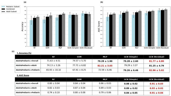 For completeness, the overall classification accuracies of the models of the adult-enriched pediatric dataset are presented in Figure 2 for the overall testing set and the sub-sets of adult and pediatrics. Overall, the GCN models demonstrate the strongest performance across accuracy and AUC metrics. Notably, the multi-layer perceptron also exhibits strong classification ability under this training approach.