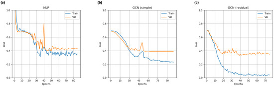 Representative training and validation loss curves for multi-layer perceptron (a), simple graph convolutional neural network (b), and residual graph convolutional neural network (c) classifiers trained on the adult-enriched pediatric dataset.