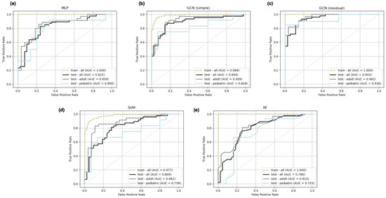 Receiver operating characteristic (ROC) curves on the training and test set for all models from a representative cross validation split are depicted in Figure 4. Three ROC curves are displayed for each test set, corresponding to the overall test set and the pediatric and adult stratifications. As follows from the AUC score results, the GCN models demonstrate the strongest ROC curves.