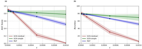 All deep learning models trained on the adult-enriched dataset were tested on adversarial test sets, generated by targeted FGSM attacks on the pediatric stratification of the enriched test dataset. Perturbation sizes between 1.0 × 10−5 and 1.0 × 10−3 were tested. Accuracy and AUC score results for all deep learning models on perturbed examples are shown in Figure 6. The simple GCN model remains the most robust to adversarial attacks, followed by the multi-layer perceptron and the residual GCN, respectively.