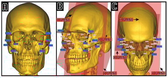 For each landmark point, the distance between itself and the three orthogonal planes XYZ was measured and compared between pre-operative, post-operative, and computer-assisted zygomatic positions.