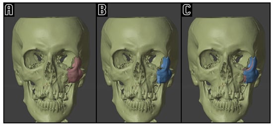 Example of computer-assisted reposition simulation: on the left side (A), the pre-operative situation with a conspicuously dislocated ZMC (red); on the center (B), the ZMC (blue) is virtually repositioned. On the right side (C), the superimposition of the two ZMC positions, highlighting the simulated symmetrization of the midface.