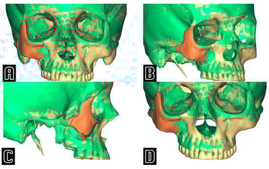 Frontal (A), oblique (B), lateral (C), and downward inclined (D) projections showing the superimposition between the actual post-operative result (green) and the virtually simulated position of the zygoma (in beige the skull, in orange the repositioned zygoma), emphasizing the undercorrection of the post-operative ZMC when compared to the computer-assisted “optimal” position.