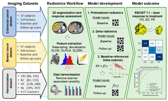 Liver metastases from breast and colorectal cancer present a significant clinical challenge, and early assessment of response to systemic therapy is crucial for optimal patient management. Delta radiomics, which analyzes changes in radiomic features between pre- and post-treatment images, offers a promising approach for monitoring and predicting therapy response. By quantifying the changes in tumor characteristics captured through radiomic feature analysis of paired pre- and post-treatment medical images [12,13,14,15], this technique has the potential to identify imaging biomarkers that enable earlier and more accurate prediction of treatment outcomes. This, in turn, could lead to more personalized and effective treatment strategies for patients with metastatic breast and colorectal cancer. Several recent studies have explored the application of machine learning and CT Delta radiomics to predict tumor response in colorectal and breast cancer liver metastases treated with chemotherapy or targeted therapy (see Table S1 for a summary of key studies) [16,17]. For example, Ye et al. [18] demonstrated the potential of Delta radiomics, analyzing changes in CT features before and after chemotherapy, to improve the prediction of progression-free survival in patients with colorectal liver metastases, particularly when combined with clinical characteristics. Their model, based on Delta radiomics and clinical data, outperformed models based on single time-point radiomics. Similarly, Lu et al. [19] showed that a deep learning network can effectively capture tumor morphological changes beyond size, improving early prediction of treatment response to anti-VEGF therapy in metastatic colorectal cancer and outperforming traditional size-based assessments. Integrating this deep learning approach with conventional size measurements further enhanced predictive accuracy, suggesting its value for personalized early treatment decisions in metastatic colorectal cancer. These findings, while promising, highlight the need for further research to validate the potential of Delta radiomics for early response assessment and personalized treatment strategies, particularly in breast cancer liver metastases.