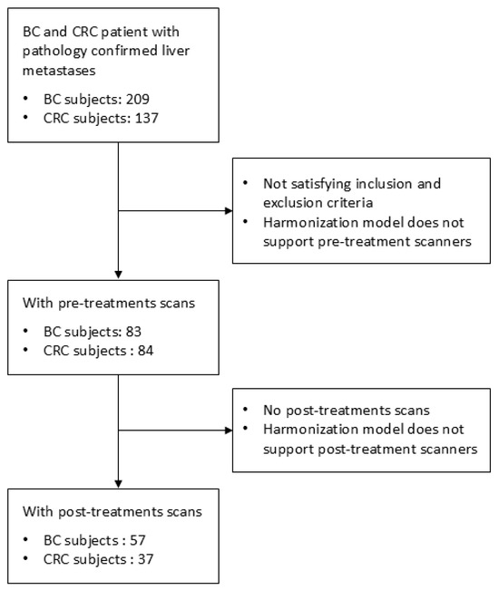 The search resulted in two datasets. The first dataset consisted of 83 BC and 84 CRC patients with 155 and 192 liver metastases, respectively, with pretreatment CT scans. Of these patients, 57 BC and 37 CRC patients with 106 and 109 liver lesions underwent post-treatment CT imaging, forming the second dataset. The first dataset was also used for radiomics data harmonization, with additional pretreatment CT imaging of 228 patients with 280 hepatic cysts and 707 samples of normal liver parenchyma [24]. Clinical data for both datasets, such as age, sex, lesion size, and follow-up period, can be found in Table 1. Information regarding the chemotherapy regimens used in the study is available in the Supplementary Material (Table S2).