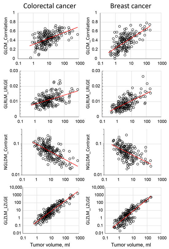 Scatter plot demonstration of association between radiomic features and the tumor size. The red line represents the fitted result.