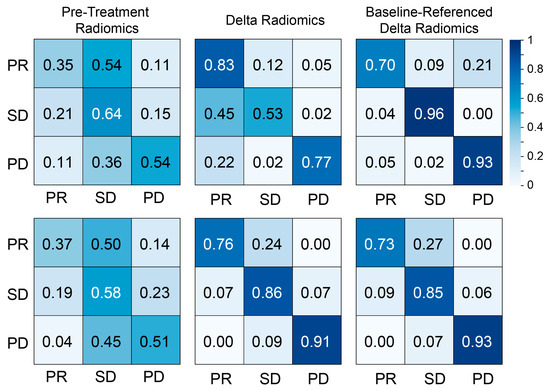 Figure 4 shows the confusion matrices for each model calculated using the Random Forest model. Pretreatment radiomics exhibited weaker correlations with patient outcomes compared to the Delta radiomic and baseline-referenced Delta radiomic models. In contrast, the Delta radiomic and baseline-referenced Delta radiomic models demonstrated better predictive performance across all classes (PR, SD, and PD) for both CRC and BC patients. Notably, the baseline-referenced Delta radiomic model consistently showed higher correlations than the Delta radiomic model across both cancer types. These metrics are summarized in Table 2. The performance of other machine learning models (LogitBoost, svmRadial, and pcaNNet) for response assessment in patients with CRC and BC liver metastases is summarized in Tables S5–S7.