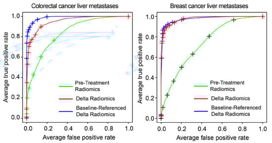 Receiver operating characteristic (ROC) curves for predicting chemotherapy response in liver metastases from colorectal cancer (left) and breast cancer (right) using pretreatment radiomics, Delta radiomics, and baseline-referenced Delta radiomics.