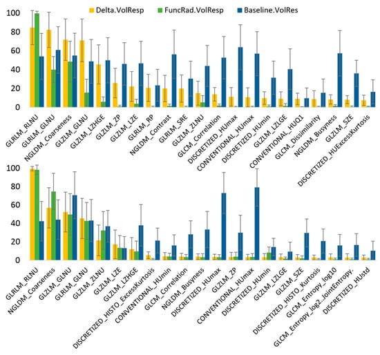 Feature significance for pretreatment radiomics, Delta radiomics, and baseline-referenced Delta radiomics response assessment models computed for patients with liver metastasis from (top) colorectal cancer and (bottom) breast cancer.