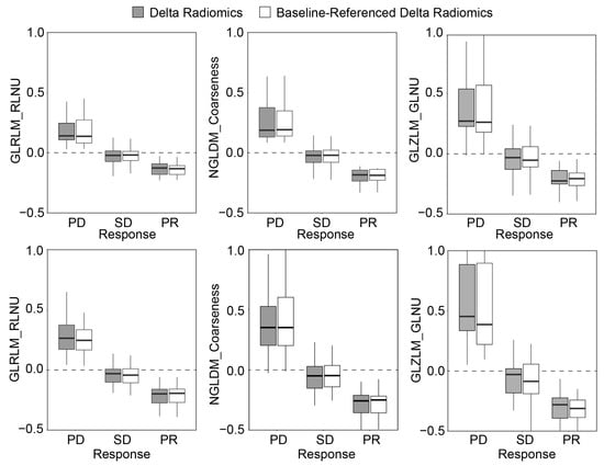 Change in the value of the three most significant features (Figure 5) for Delta radiomics and baseline-referenced Delta radiomics response assessment models computed for patients with liver metastasis from (top) colorectal cancer and (bottom) breast cancer.