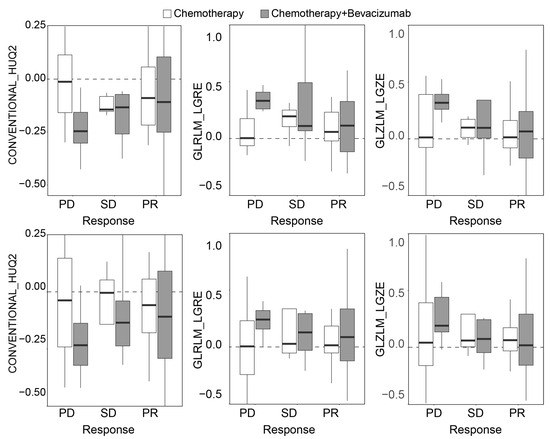 We also investigated differences between treatment groups within the CRC cohort, which included patients receiving either chemotherapy alone or chemotherapy in combination with bevacizumab. Bevacizumab, an anti-VEGF agent, targets tumor vascularization and is therefore expected to influence contrast enhancement patterns on CT. Table S2 provides detailed information about the chemotherapy treatments received by all patients. Figure 8 illustrates changes in several radiomic features—computed using the Delta radiomics and baseline-referenced Delta radiomics models—across treatment groups and response categories. Specifically, the median lesion intensity (CONVENTIONAL_HUQ2) showed a notable difference between treatment groups within the PD category. This suggests that bevacizumab may be associated with reduced contrast enhancement in progressive disease, potentially reflecting its anti-angiogenic effects. Other radiomic features, such as GLRLM_LGRE and GLZLM_LGZE, also show a similar tendency within the PD group. These features indicate changes in tumor heterogeneity. This suggests that bevacizumab not only reduces contrast enhancement but also affects the structural complexity of tumors in progressive disease, highlighting its potential impact on tumor biology.