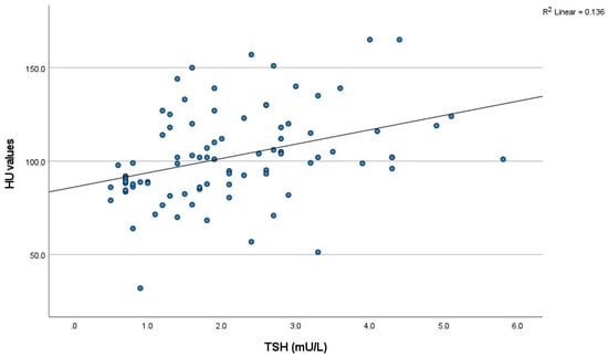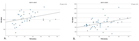 A significant positive correlation was identified between thyroid density and TSH levels in a subgroup of 39 patients with SECT non-contrast scans (p = 0.006, R = 0.435) (Figure 2). In this group, a negative correlation was observed between the thyroid density values from these scans and FT4 levels, although it was not statistically significant (p = 0.169, R = −0.389) (Table 3).